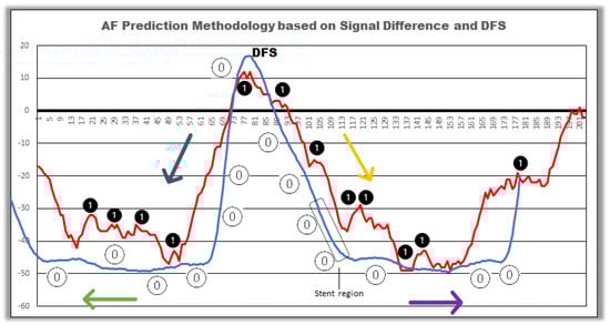 The Atrial Fibrillation red signal contains a chaotic signal with varying amplitude and highly irregular RR-intervals, with no P-wave; it is marked as number 1 based on the filters’ output. In the GPU kernel algorithm, if any occurring data point differences are more than a certain set threshold when compared to the normal sinus rhythm signal, then that data point is also marked as number 1, to show that there are various irregular jitters and unknown signals, and that there could be a possibility that the signal represents an Atrial Fibrillation condition. The signal difference is used to differentiate the data points in both the red and blue signal and then compare those signals for medical professionals for thorough analysis. After the signal differences and further applied depth first search algorithm, applied as a kernel on the GPU for both the signals, the colored arrow marks show how the left, right and bottom traversals’ data are fed to the DFS kernel, which is a node shown in Figure 5. From there, if the traversals predict at least number 1 in any direction in any part of the signal, then there is a percentage prediction from 45% to 98%, based on the occurrences of number 1 for Atrial Fibrillation prediction in red signal, while number 0 is always considered normal sinus rhythm, as shown in Figure 5. The signal difference and DFS algorithm help predict, analyze and understand the heart signal thoroughly, not only for arrythmias, but also for patients who have undergone surgeries such as stent and angioplasty because, based on discussion with surgeons, the signal waveform varies at the stent region for normal sinus rhythm as well, as represented in Figure 5.