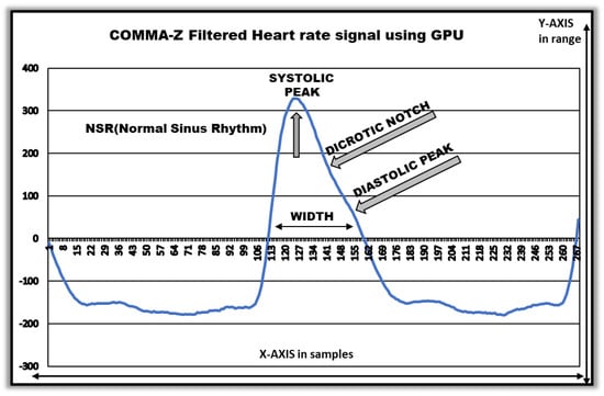 While working with one of the top surgeons from Michigan, who is also one of the authors in this paper, the related outcome of these experiments was thoroughly communicated and experimented. In this paper, the raw data were processed with various filters, as discussed in the methodology section and system design section. The software algorithm developed for filtering was applied on both CPU and GPU and benchmarked accordingly for various use cases and conditions. As shown in Figure 8, the waveform clearly explains the content of the PPG signal. The signal waveform was a final output after applying the COMMA-Z algorithm. The systolic peak, dicrotic notch and diastolic peak are the most important occurrences of a PPG heart signal. All these occurrences on a signal are at both the earlobe and fingertip. The generated heart rate sample below is from a subject who was a 32-year-old male participant.