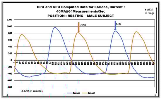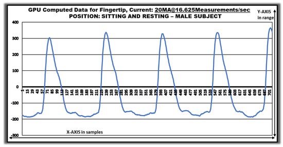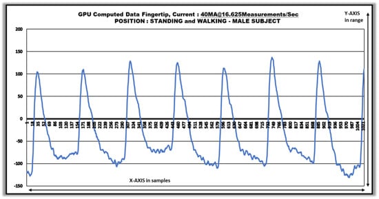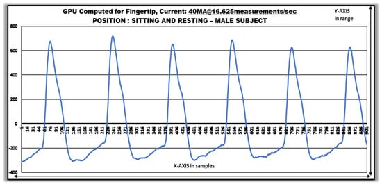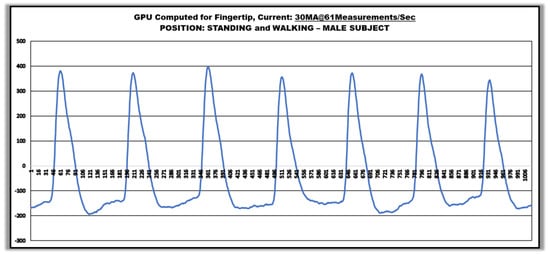 In Figure 10, we manually updated the current and measurements/sec accordingly for the sensors, via the OTA access to the circular earlobe device sensor, to observe the changes in the GPU computing at the fingertip, compared to the previously-participated 29-year-old male subject. We determined that the amplitude at the y-axis was not greater than 380 and had been reduced when compared to Figure 9, which was 700. Additionally, the width in Figure 10 was formed slightly better than Figure 9, showing better computation at the dicrotic peak. In Figure 11, we had an opportunity to compute GPU data for a male subject who was 35 years old, and we saw that while he was standing and walking, there were jitters and some added noise due to artifacts, which were later fixed by setting the current sensor values for less penetration of current to the skin, because the raw value in this situation was between 63,000–65,000, showing it was too high of a current. To all the use cases and to all the participants here, we have applied COMMA-Z to predict the results.