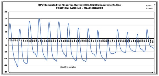 Then, we asked the subject to dance, move and perform some activity. As shown in Figure 13, the amplitude and width of the signal were reduced because the subject was breathing faster when compared to walking and standing, and we could see how well the signal was computed without any noise and vibration. Here, we increased the measurements/sec to 250, providing an enormous amount of data to the GPU to perform better computation.