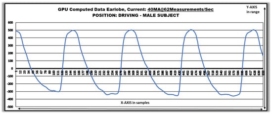 The participant was a male subject who was 41 years old, and this time we conducted this experiment while the participant was driving. We started recording and computing data while he was driving. Based on the current and measurements/sec, we could compare how well the data had been computed based on the width, dicrotic notch and peak, but irregular intervals and faster or slower atrial and ventricular rate could more easily be predicted than on a fingertip. The earlobe normal sinus rhythm was as shown in Figure 14. Figure 15 shows the GPU-computed Atrial Fibrillation data at the earlobe from a male subject who was a current patient. As our device required passive touch capabilities, it was easier and faster to collect data using the PPG technology to compute, and we have already discussed one of these signal predictions and analyses in the methodology section as to how we predicted the Atrial and Ventricular Fibrillation.