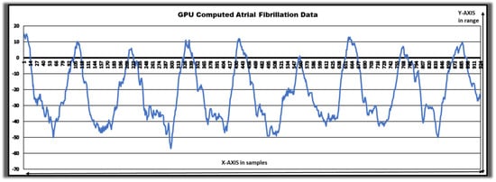 The signal was compared with the normal sinus rhythm and then we proceeded to apply signal differentiation and DFS kernel on the GPU after we received the COMMA-Z filtering. The signal description in Figure 15 clearly showed the prediction of atrial fibrillation. We also ran the similar functions used for a GPU on a CPU-only device and found that the computation and prediction were inadequate. We have more use cases that show how well CPU and GPU computed such data.