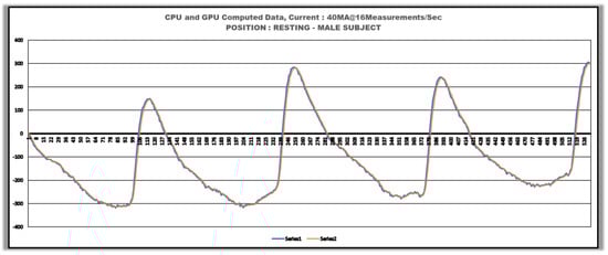 Finally, from Figure 16, we also understand that during acute Myocardial Infarction, or any arising conditions when a stent is placed, the observation of the signal with and without stent can clearly and thoroughly be observed on a GPU better than a CPU [,,].