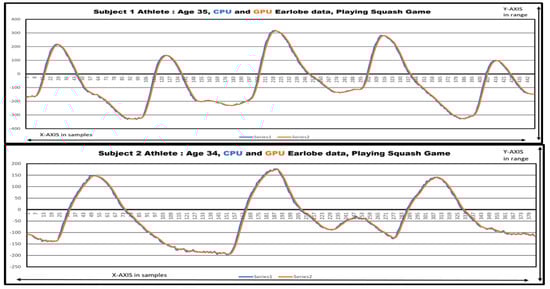 Figure 19 shows an experimental observation of squash players with the sensor attached to the earlobe while playing. As observed in Figure 20, Athlete 1 and 2 show tremendous changes in CPU and GPU data when zoomed in. The filtering techniques were conducted at similar speeds here but the GPU, in general, computed faster and more smoothly than the CPU. The zero crossing detection is clearly observed in Athlete 2 where some spikes do not satisfy the algorithm.