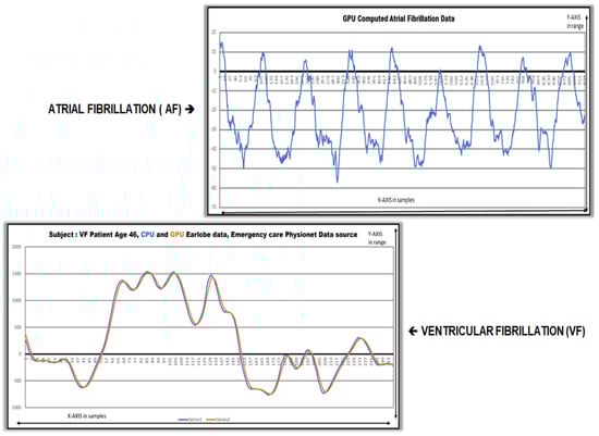 The COMMA-Z filter was implemented and designed for a GPU to perform prediction and analysis studies, and this could not be possible without the Vishay VCNL high-power IRED advanced proximity sensor, which incorporated powerful photodiodes and amplifiers into one single CMOS process that consisted of high-sensing capabilities using green and red LED light reflections []. The proposed method in this paper is explained from the ground up, and prediction and analysis of heart disease are widely discussed and analyzed. Various clinical datasets were generated from real patients for heart data. The reason for choosing the GPU was to quicken the process without errors, in order to predict well in advance an arising heart condition. An overall true positive rate (TPR) of 98.95% was achieved with a true negative rate (TNR) of 14.78%, suggesting that PPG is a more viable option for arrhythmia detection than ECG if the PPG sensor is placed at the earlobe region. This overall rate is also due to GPU parallel computing using COMMA-Z filter, and related filtering techniques, and this rate would not be possible if there was only a CPU. To understand the occurrences of atrial and ventricular conditions, we have worked with top cardiologists from Beaumont Hospitals and have received their feedback and support. Atrial Fibrillation has chaotic signals with irregular RR intervals with varying rhythm, and the signal has no pattern, with a lot of jitters, as shown in Figure 1 []. Atrial rate varies between 300–700 beats per minute and ventricular is typically between 80–180 beats per minute. Ventricular Fibrillation leads to death and a person’s lifespan is lowered if this condition occurs. This condition shows a high heart rate of 150–500 beats per minute on the ventricular side with disorganized rhythms and the patient dies due to stroke or cardiac arrest, as shown in Figure 1 [].
