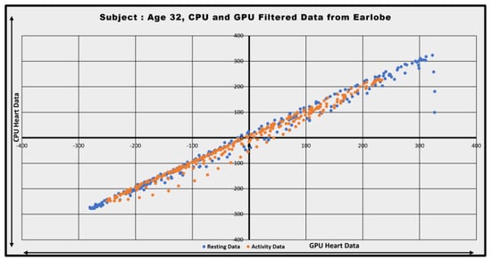 The Jetson Tx2 is a combination of CPU and GPU, connected via PCI bus, where we applied COMMA-Z filter to CPU as well for comparison. In Figure 16, we made sure that the same raw data from the earlobe device were being sent to the CPU on Jetson device, which is marked as series 1 in the figure, and GPU, which is marked as series 2. Here, speed did not come into picture because we wanted to compare how the novel COMMA-Z filter behaved on both CPU and GPU.