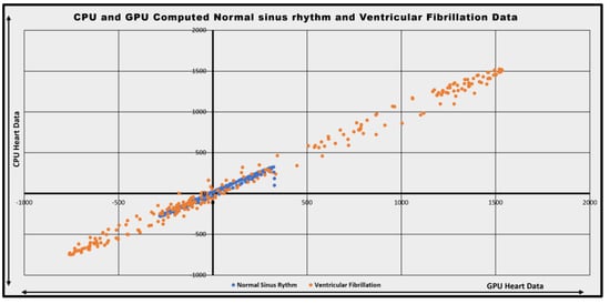 This observation will lead to solving many arising problems and helps find easy solutions for medical professionals. Any detections can easily be observed using the GPU-computed signal rather than using a CPU [,,]. In Figure 17, we applied the raw data to the CPU and GPU simultaneously to see how fast the prediction and analysis were and also how clean the signals were; we concluded that the GPU was 132.20 times faster than the CPU. In Figure 17, we see that the GPU signal has already computed the raw data while the CPU is still computing. The major core reason for the time delay here is because of the 3-point and 5-point median filtering. The 3-point filtering is the best performance a CPU can obtain because, if it is more than 3-point (such as 5-point), then the loops have to store the array data repeatedly and move the window continuously, which will consume time while losing data based on environmental conditions or improper computation. Conversely, in GPU, the best performance can still reach up to 8-point but, for these scenarios, 5-point was the best method because the window moves continuously for all the threads in a block, synchronizing the threads. Nevertheless, the zero crossing algorithm behaves similarly for both CPU and GPU but the GPU again outperforms the CPU for signal differentiation and DFS for prediction of diseases and conditions. In Figure 18, we made use of the Physionet data available to show how a normal sinus rhythm and Ventricular Fibrillation look, because ventricular condition data cannot be collected from patients, since this situation is extreme and the person is under emergency care, due to their high heart rate and possibility they may soon die or end up in cardiac arrest. These signs and predictions in early stages can clearly be predicted using the GPU, COMMA-Z, signal differentiation and DFS algorithm, which similarly predict other diseases and conditions as well. The below signal is an ECG from Physionet but the behavior is similar for PPG because Ventricular Fibrillation has no rhythm and a chaotic signal with very high heart rate. The signal differentiation and DFS method can easily predict in real-time when computed on a GPU.