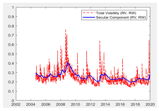 Here, Equations (9) and (10) represent rw generalizations of the long-run component with univariate RV specification in Equation (4) and the multivariate Xt−k specification given in Equation (6) [60]. In GARCH-MIDAS with rw specification, the long-run component follows a dynamic process which changes over time at each i and t due to the rolling-windows sampling of the total sample [3,53].
