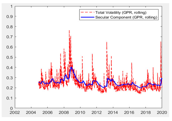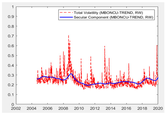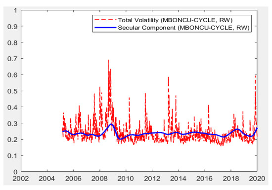 Moreover, the models are capable of producing total volatilities decomposed into short-run and long-run components. As presented in the methodology section, total volatility is the multiplication of short-run and long-run components. The Figure 1, Figure 2, Figure 3, Figure 4 and Figure 5 below present the total volatility (red, dashed) and the long-run component of volatility (blue line) modeled with realized variance, geopolitical risk, industrial production trend, and cycle indices and composite leading indicators, respectively. To save space, a selected set of results are reported, which cover all economic indicators and the univariate RV-based findings.