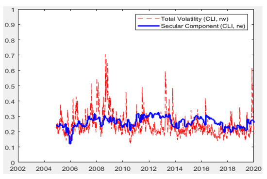 Figure 1, Figure 2, Figure 3, Figure 4 and Figure 5 indicate the following: In all specifications, the long-run components follow a relatively smooth process, which goes through the central tendency of total volatility. However, the CLI-based model results provide an exception. The CLI based long-run component is clearly more volatile than those reported for all other indicators. This is because the CLI is an index of future expectations and is likely to uncouple from stock volatility in uncertain times such as the period analyzed, with significant uncertainty about future expectations during COVID-19. This also becomes evident in the figure during the economic recovery period after 2009 global crisis. In all models, the sharp incline in the long-run coupled with the incline in the total volatility is clearly evident for the period that started in early 2020. A relatively higher level of variance is noted towards the last observations of the figure. Such findings indicate the efficiency of the proposed models in integrating the effects of economic indicators to volatility modelling, especially in terms of GPR, IPIC, IPIT, and, lastly, CLI indicators.