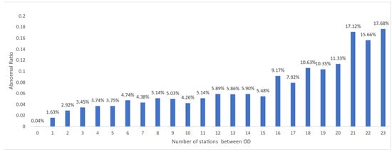 Figure 2 and is represented by a bar chart. The abscissa represents the number of interval stations between OD, and the ordinate represents the abnormal proportion.