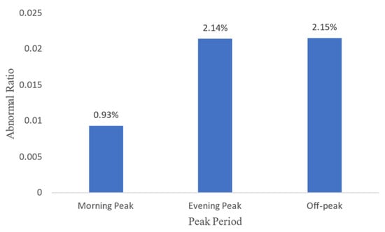 Figure 3 and is represented by a bar chart. The abscissa represents different peak periods (morning peak, and evening peak, and off-peak, respectively), and the ordinate represents the proportion of abnormal behavior.