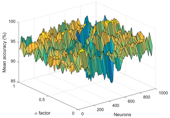 Accuracy obtained using Algorithm 1 (grid approach varying the number of neurons and factor in a grid).