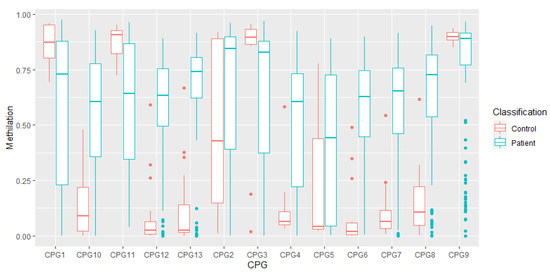 Algorithm 1 then expands this approach for a grid of different numbers of neurons, as can be seen in Figure 3. This approach resulted in a model with only 13 CpGs selecting an accuracy of 97.69%. The specificity and sensitivity of the model were 98.26% and 95.02%, respectively. The number of neurons selected was 790. The average methylation level for these 13 CpGs (for control and patients) can be seen in Figure 4. The list of these 13 CpGs can be found in the Appendix A (Table A1).