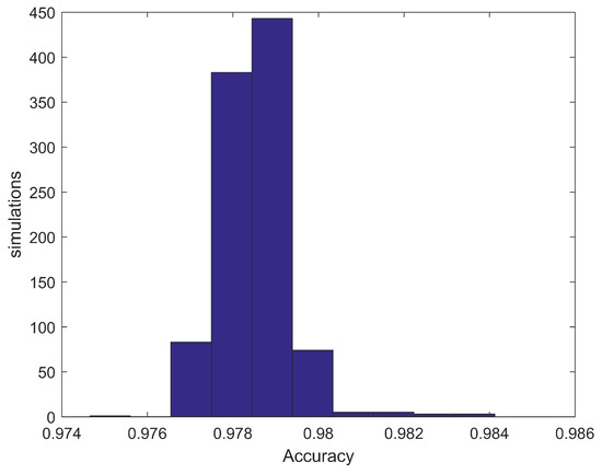 Histogram of the accuracy obtained in 1000 simulations.