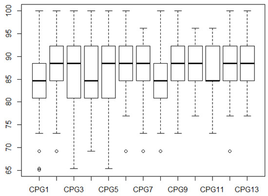 As usual in nonlinear models, the data need to be divided into a training and a testing dataset. The testing dataset contains approximately 20% of the total data. Furthermore, 10% of the data (training dataset) were used as validation data. We carried out cross-validation 10 times. There are several interesting papers covering validation, see for instance [54,55]. The testing dataset was not used during the training phase. The reported measures, such as accuracy, sensitivity and specificity, are those obtained in the testing dataset (unused duting the trainign phase). A preliminary step consists in filtering each CpG individually using binomial regression. In this regression, the independent variable is the methylation level for each CpG across all patients in the training dataset, and the dependent variable is Y (Equation (2)). In this first step, all the CpGs with a p-value bigger than 0.05 were excluded from the analysis.
