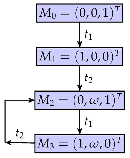 In the research on DESs based on Petri nets, there are few studies on unbounded net systems. Ushio et al. [22] reported a method of fault diagnosis by using a partially observed UPN, where all transitions are unobservable and partial places are observable. In [22], two diagnosers, a simple diagnoser and an -diagnoser, were constructed to analyze the diagnosability of an underlying system by monitoring the token counts and their changes in observable places. Moreover, the work in [23] improved the results in [18] by extending the diagnosability analysis in bounded net systems to unbounded net systems using a verifier net. In addition, when analyzing the state space of an unbounded net system, its coverability graph [24,25,26] has to be considered. In [27], Lefaucheux et al. extended the concept of BRGs to unbounded net systems. The authors analyzed the relationship between coverability sets and reachability sets. After the definition of BCGs was proposed, the relationship between BCGs and BRGs was further analyzed. Based on the proposed BCGs, the diagnosability analysis for unbounded net systems was significantly improved by the team who originally developed the notion of BRG with a deluge of results. For example, it was shown that an unbounded net system is diagnosable iff there does not exist any cycle in the BCG with the relevant set of fault transitions. However, the investigation of further applications of the BCGs is still open.