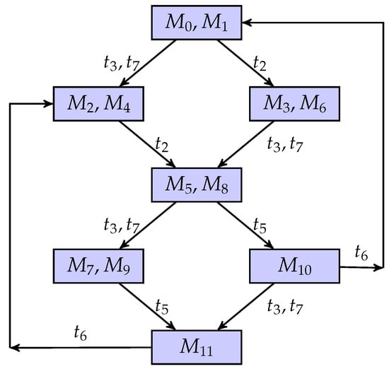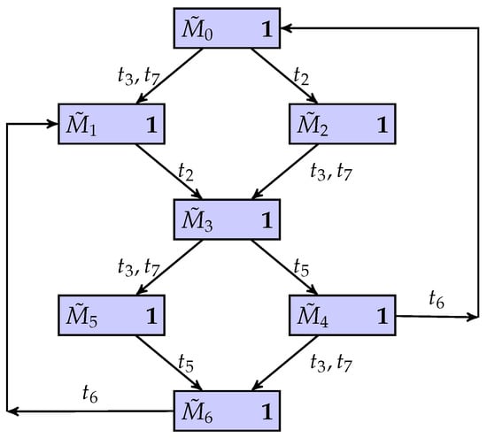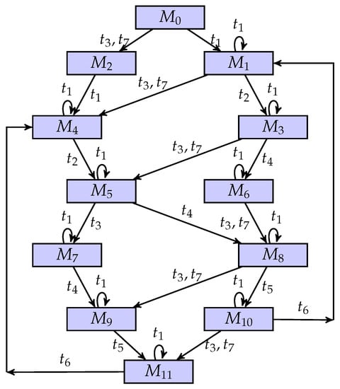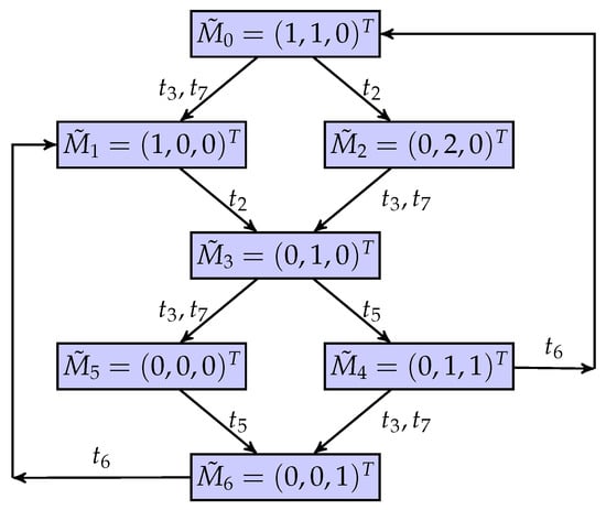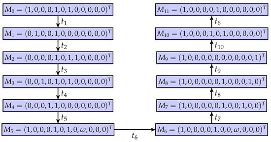 The system is modeled by Petri nets in Figure 9, where places and all transitions are unobservable. Furthermore, the meanings of all places and transitions are displayed in Table 3. A coverability graph is shown in Figure 10, where a marking of the system is denoted as . Based on the set of unobservable places, we can infer that the set of truly unobservable transitions is , and . Moreover, the mapping matrix is assumed as follows by using the technique presented, as aforementioned: