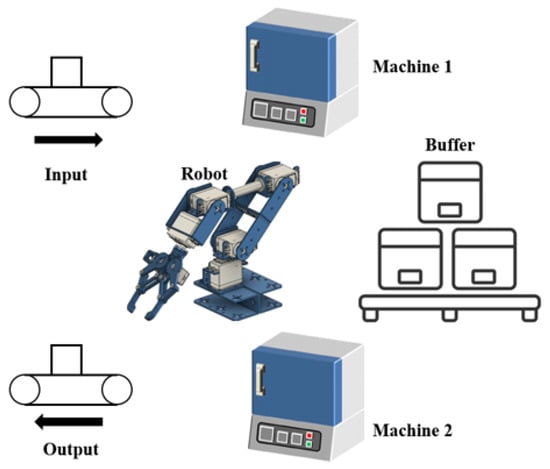 A small but comprehensive flexible manufacturing cell [34] is considered as shown in Figure 8. The reason that we choose a manufacturing cell as an example lies in the fact that such an example is easy to understand and captures the methods developed in this paper. The system is composed of one robot, one input buffer, one output buffer, and two machines. The robot and the machines can only deal with one part when the system is working. Specifically, the buffer can be regarded as an infinite bin, i.e., its space capacity is unlimited, which is different from the traditional modeling methods that assume such a buffer is bounded. The workflow of this system is as follows: When a sensor detects that the goods to be processed enter the input buffer if the robot and Machine 1 are available, the robot will put the goods into Machine 1 for processing. When the work of Machine 1 is completed, the robot puts the goods into the buffer for storage. Machine 2 will regularly use the robot to process goods. The robot will put the goods into Machine 2 from the buffer. If the buffer is empty, the robot will directly put the goods into Machine 2 from Machine 1. When Machine 2 finishes the processing, the robot transfers the goods to the output.