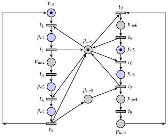 As shown in Figure 3, a partially observed UPN is considered. Table 1 and Figure 4 show the list of markings and its coverability graph, respectively, where a regular marking is denoted as .