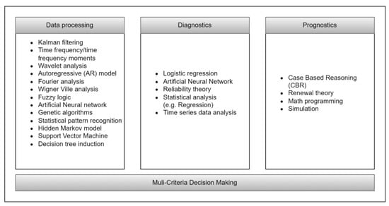 Figure 1 shows the most typical CBM techniques presented by [20]. There are three major families of techniques: data processing, diagnostics, and prognostics. Data processing focuses on handling and analyzing data or signals and transforming them into an interpretable form. Diagnostics are responsible for fault detection, when and what kind of fault happened, and which components were affected. Prognostics attempt to predict upcoming faults.