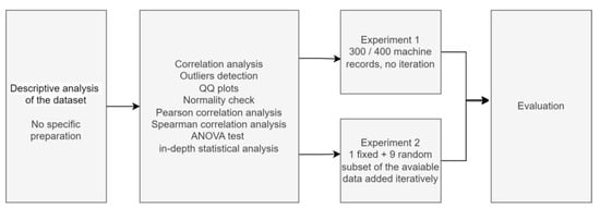 In this paper, a data-driven method is studied. The research hypothesis is that by investigating a database that contains records of machine errors and failures along with further telemetry data of those machines, this will allow the machine errors to be predicted with some expected probability. The research project focused on investigating a boosting algorithm, which will be discussed later. In our methodology, the dataset was divided into two parts. Within the available time range, the time of the investigation split the dataset into historical and future data. By using the historical data, predictions were made for the ‘future’, i.e., to the time after that point. The predictions were then compared with the real facts. The research workflow is depicted in Figure 2.