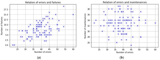 - There was a moderate correlation between error statements and failures, with a value of 0.448. This was only −3.028 × 10−6 between error statements and maintenance, while in the case of failures and maintenance, this was −0.04585;