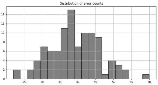 Based on the results of the normality analysis, we decided to use the Spearman correlation coefficient r [33,34] between the number of errors and the number of failures. The obtained Spearman r = 0.448 numerical value indicated a moderate correlation. For verification, if r was statistically significant, we have calculated the 95% confidence interval (CI) obtaining [0.2703, 0.5961]. We found that r > 0 and 0.2703 > 0, which proves that the correlation was statistically significant. Additionally, we have applied the statistical ANOVA test at the significance level αANOVA = 0.05 for verification of the hypothesis that r was statistically significantly different from 0. The obtained p-value of 0.0001 indicated that the difference was statistically significant (0.0001 < αANOVA).