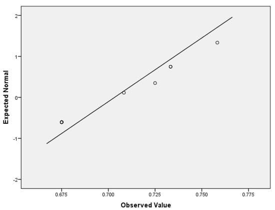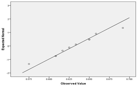 Based on the fact that the sample size [61] was 10, which is very small, we have chosen the application of the Shapiro–Wilk test (SW) of normality at the αnorm = 0.05 significance level. We obtained, as the results, the test statistics 0.851 and the p-value 0.06 (0.06 ≥ αnorm), which indicated that the data passed the normality assumption. Based on this finding, the best indicator of the central tendency was the mean = 0.7988. The results also indicated that the 95 CI% of the mean [0.7157, 0.8819] must be reported.