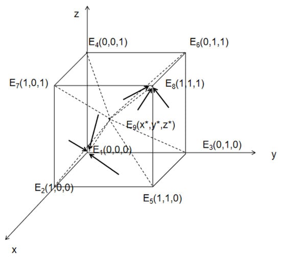- When ; , at this time, the E9(x*,y*,z*) is the unstable point. It shows that the probabilities of government regulatory departments, small and medium-sized enterprises, and consumers are constantly changing internally, as shown in Figure 1. The probability of final convergence to what state is dependent on the phase volume. The analysis of the influence of the different influencing factors is shown in Table 3. Influencing factors include the regulatory intensity of government regulatory authorities , earnings from active performance, punishment, and loss from negative performance. When these influencing factors increase, x*, y*, and z* all decrease, E9 is close to E1(0,0,0), and thus the phase volume composed of the stabilization strategy E8(1,1,1) increases, then the probability that the three subjects will choose the (active supervision, active performance, positive evaluation) action strategy increases.