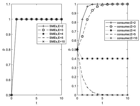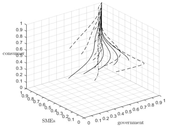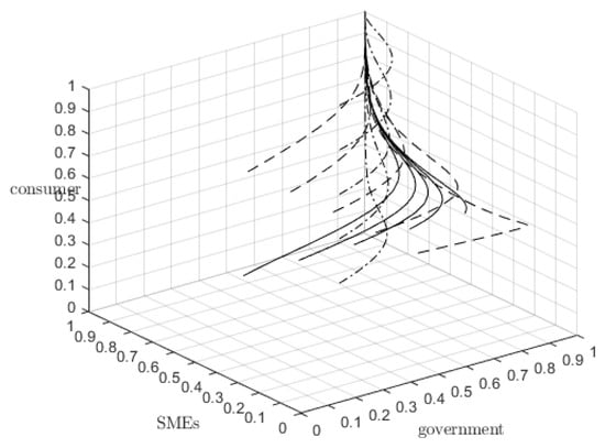 - When ; , at this time, there is an inner stable point in the replicator dynamics equation, which means that the government regulatory agencies, small and medium-sized enterprises, and consumers, respectively, choose strict supervision, active implementation, and positive evaluation with a certain probability. At first, the government regulatory agencies choose not to strictly regulate them because they want to obtain certain benefits, and they have performed well. Small and medium-sized enterprises, due to lax supervision, negatively perform their corporate social responsibility. Consumers choose to make negative evaluations of small and medium-sized enterprises because of their negative performance of corporate social responsibility and reduce the purchase of goods from negative social responsibility enterprises. Thus, the efficiency of small and medium-sized enterprises decreases, the business environment is poor, and environmental pollution is serious. After the discovery of this phenomenon, the government regulatory agencies urgently seek rectification and choose to improve strict supervision. Finally, under the strict supervision of government regulatory agencies, small and medium-sized enterprises choose to actively fulfill their corporate social responsibility to a certain extent. The probability of consumers giving positive evaluations to enterprises increases. Therefore, the three main bodies will choose the mixed strategy in the constant dynamic game.