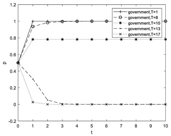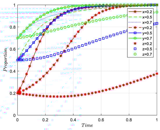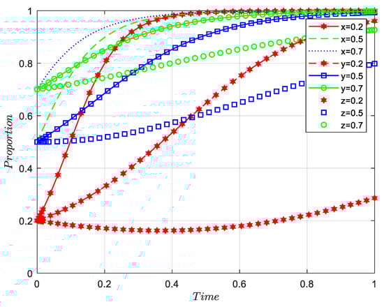 4.2.1. The Effect of Different Initial Strategy Choices on the System Evolution