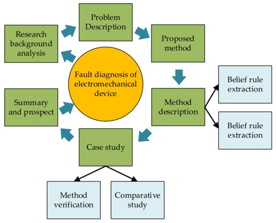 Focusing on the problem of electromechanical device fault diagnosis, the whole work of this paper is divided into seven steps, as shown in Figure 1. Starting from the fault diagnosis of an electromechanical device, this article first briefly introduces the main methods of fault diagnosis. Then, the problem that qualitative text data cannot be used in fault diagnosis method based on BRB is found, and the solution to this problem is put forward. This method is divided into two parts: (1) extraction of belief rules and (2) supplementation of belief rules. Each part is introduced in detail. After that, the effectiveness of the method is illustrated by method verification and comparative study. Finally, the application of this method in the fault diagnosis of electromechanical devices is summarized and prospected.
