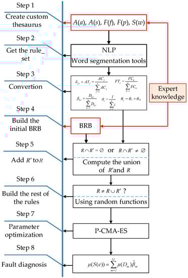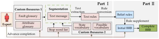 Before the method is executed, the expert needs to complete three tasks: (1) the establishment of a custom thesaurus, (2) the selection of a stop word list, and (3) the construction of an initial BRB. The custom thesaurus includes attribute vocabulary, attribute state vocabulary, fault vocabulary, and fault level vocabulary. It is possible that some belief rules in the initial BRB cannot determine the parameters and need to be supplemented.