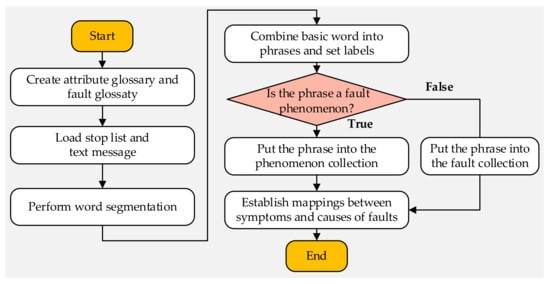 According to the structure of the belief rule, the information extracted from the text needs to be made up of two parts. The first part is the IF part of the rule, which describes the fault phenomenon, including the system attributes and the value of attributes. The second part is the THEN part of the rule, indicating the fault cause phenomenon, which is composed of the fault of the system and the belief degree of the fault. The key to extracting rules from text is to find the information that makes up the IF part and THEN parts. This requires the word segmentation function of NLP, combined with a custom thesaurus, to decompose the statements in the text into words [26]. Then, extract the key information from these words. Finally, this information is combined into a phrase describing the fault phenomenon and a phrase describing the fault cause phenomenon. Considering the complexity of Chinese and the possible irregular description of text information, this paper assumes that the description of fault information in the text to be processed is relatively accurate. The content of the custom thesaurus does not appear between the description of the phenomenon and the cause of the fault. Moreover, the description of the attribute state and fault level has been fully included in the attribute state vocabulary and fault level vocabulary. The specific process is described as follows: