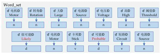 Step 3: Obtain a collection of phrases to be grouped using a custom thesaurus. is traversed, and the useless words are found and removed from it by using the stop word table, namely . Based on the attribute vocabulary, attribute state vocabulary, fault vocabulary, and fault level vocabulary, the corresponding basic words are found from and recombined to obtain the fault symptom phrase and fault cause phrase and set labels p and f for them, respectively. Finally, put these phrases into the words set to be grouped .