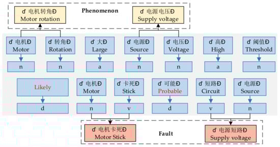 In the Chinese context, the commonly used grammatical structure is “attribute + state”, and adjectives dominate the description of the state. Therefore, this can be taken as a condition. After finding an attribute, continue to look for an adjective appearing in S(A) to form a fault phenomenon phrase with the attribute. The commonly used grammatical structure for the fault cause is “level of failure + cause of failure”, and the description word of the level of failure is an adverb. With this condition, after finding a fault cause, backtrack to the left to find an adverb that appears in L(p) to form a fault cause phrase with the fault cause. Put the successively obtained phenomenon phrase and cause phrase together with their labels “p” and “f “ into phrase_set(ph), as shown in Figure 6.