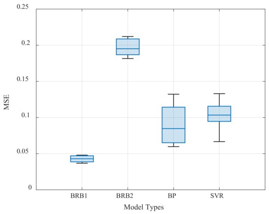 It can be seen from Table 19 that the average MSE of the method proposed in this paper (BRB1) is lower than that of the other three models in the case of three different proportions of training sets. Among them, the average MSE of BRB2 is higher than that of BRB1 due to the random set of four rules in traditional BRB (BRB2). BP and SVR have commonly used machine learning algorithms. Since they need the support of large data samples, their MSE is higher than BRB1, with only 72 data samples. In addition, the BRB1 also shows high stability, as shown in Figure 13.