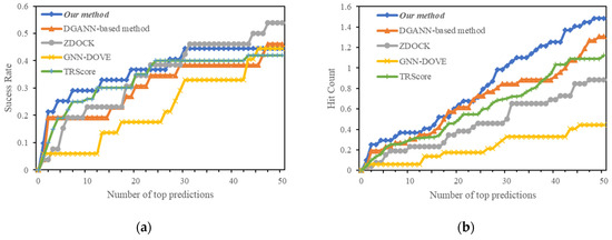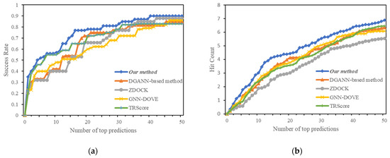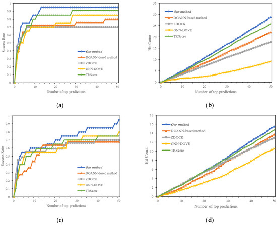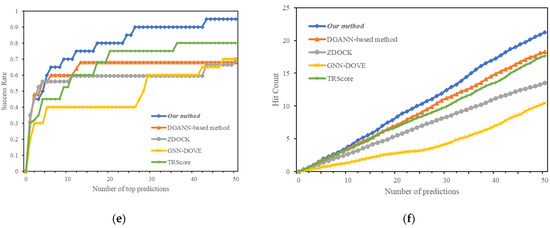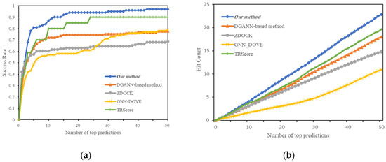 As shown in Figure 4a, for the top 50, SR of our model was higher than those of the other three algorithms. The value of SR is close to 1, which means that all the protein complexes in our dataset have at least one near-native decoy in the top 50 predictions. SRs in top 50 from the two GNN-based algorithms were close, which showed that at least one near-native decoy was detected in the top 50 predictions for the over 80% target complex. The figure showed that our method outperformed the other scoring function in terms of success rate except in the top 1. For the top 1, our method obtained an SR of 30%, which was a little bit lower than the SR of 42% by ZDOCK. Overall, our method obtained the success rates of 81% and 87% for top 5 and top 10, respectively, which were better than other scoring functions.