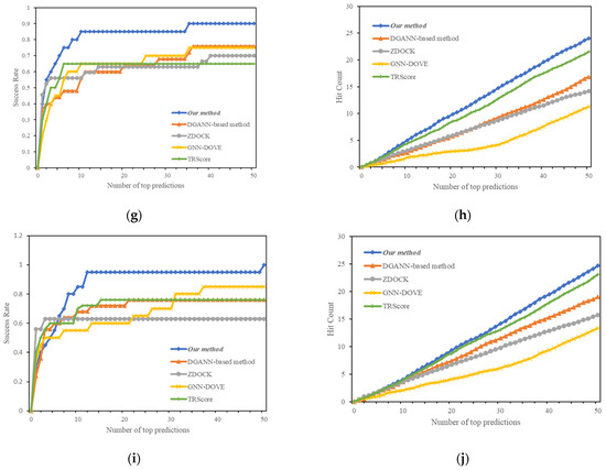 The success rate and hit count are shown for each fold in the cross-validation on the ZDOCK benchmark 4.0. (a,b) The success rate and hit count of the fold 1 test set. (c,d) The success rate and hit count of the fold 2 test set. (e,f) The success rate and hit count of the fold 3 test set. (g,h) The success rate and hit count of the fold 4 test set. (i,j) The success rate and hit count of the fold 5 test set.