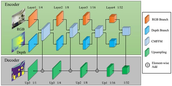 The encoder is used to extract RGB and Depth features at different levels, and then the decoder is used to convert the feature maps at different levels into the final semantic map. In order to improve the special utilization of different levels, we introduce multi-level feature supplement in the decoder and use the fused features in different levels in the encoder as the supplement to improve the robustness of the model. The model encoder consists of 4 stages. Later, cross-modal feature fusion module (CMFFM), which is presented in Section 3.3, is embedded in each stage, the RGB features and Depth features are sent to the next layer through the CMFFM, and the fusion features of RGB and Depth are sent to the decoder for feature supplementation. In Figure 1, the functions of downsampling and upsampling are to resize the image size. For example, the “1/4” in encoder and decoder part means the spatial size is reduced and enlarged to 1/4 and 4 times of the original size, respectively.