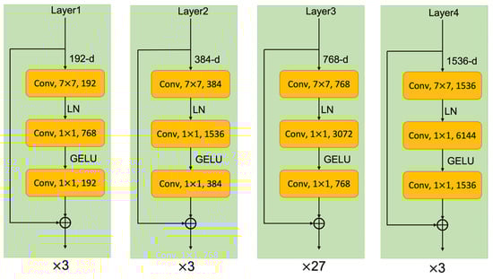 Since the proposal of VIT [33], it has rapidly replaced the convolutional network as the state-of-the-art image classification model. Using Transformer as the backbone network and introducing convolutional neural networks (ConvNet) enables Transformer to be applied in a variety of visual tasks, such as object detection, semantic segmentation, etc. ConvNeXt builds a network entirely composed of standard ConvNet modules based on the design of VIT and ResNet, which is superior to Transformer in accuracy and scalability while maintaining the simplicity and efficiency of standard ConvNet. The network structure of ConvNeXt consists of four layers shown in Figure 2. Layers 1, 2, and 4 contain three basic blocks, and Layer 3 contains 27 basic blocks. Each basic block contains three convolutional layers, and the Gaussian Error Linear Unit (GELU) [34] activation function and the simpler Layer Normalization (LN) [35] are used in each basic block. RGB image and Depth image are input through their respective branches in the model (Figure 1). After passing through the 1st downsampling layer, the RGB data and Depth data have the same data shape with 192 channels through the convolution operation (in Figure 2), and then the 192-channelled data are sent to Layer 1 for processing, and after the fusion module (i.e., CMFFM) of Layer 1, the data is sent to Layer 2 (for further downsampling) and the decoder modular (for upsampling with feature supplement) at the same time, then to Layers 3 and 4. Each Layer is connected by the downsampling layer.
