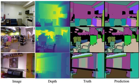 In addition, it can be seen that on the dataset of NYUDv2, the segmentation accuracy of our model is lower than that of DCANet and MGCNet, but on SUN-RGBD dataset, the segmentation accuracy of our model is the best with the highest mIoU. It shows that our model has better performance on the dataset with more training samples (for example, 10,335 samples of SUN-RGBD dataset) and slightly poor performance on the dataset with fewer data samples (for example, 1449 samples of NYUDv2). This indicates that although CMFFM proposed by us can integrate the features of RGB and Depth relatively well, it still requires a large number of training samples to learn more critical features, and there is still great room for improvement in the feature fusion of RGB and Depth.