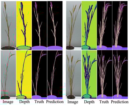 At the same time, we conduct practical application tests on the self-built RICE-RGBD image dataset, which contains two types of data, namely RGB-D data of single rice plant and whole rice cluster, as shown in Figure 5. There are 10,000 RICE-RGBD images in total in the dataset, with 6000 for training and 4000 for testing. Similar to the public dataset, the data processing includes adjusting resolution, data enhancement, data labeling and data normalization. We adjust all RGB images, Depth images and ground real images to a high spatial resolution of 512 × 160. During training, we us data enhancement to improve data diversity including random scaling, cropping and flipping to the inputs of RGB image and Depth image, respectively. For RGB images, we further enhance them by applying random hue, brightness and saturation adjustments. Both the RGB images and Depth images are normalized to 0–1. The ground real images of our rice dataset are labeled. As can be seen from the Figure 5, ConvNeXt-CMFFM is able to well segment the spike and straw of rice. This experiment shows that our model can be well used in practical agricultural application.