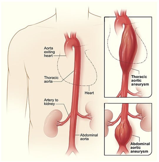 The aneurysm is one of the main pathologies affecting blood vessels [1]. It is defined as a dilation of the artery whose diameter exceeds at least 50% that of the same vessel in normal conditions. Our study is focused on the aorta artery that is the main and largest artery of the human body, originating from the top of the left ventricle and extending down to the abdomen, where it splits into two smaller arteries (the common iliac arteries). Aneurysms are mainly distinguished into thoracic aortic aneurysms (AATs), involving the aorta in the chest, and abdominal aortic aneurysms (AAAs), which involve the aorta in the abdomen areas and which are the ones analyzed in the present study (Figure 1).