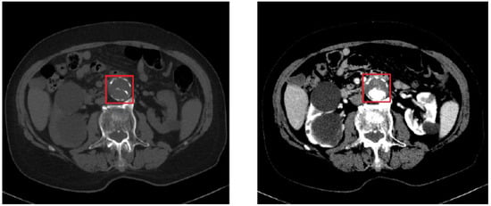 On the left, basal CT image in the presence of an AAA. In the red square (the so called region of interest, ROI) is depicted the aorta artery. On the right, CT image with contrast medium, corresponding to the same CT section shown on the left.