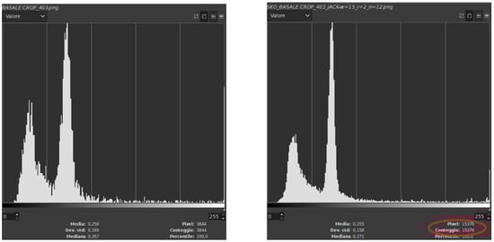 As we can see in the following histograms (Figure 4), the original ROI used as input image is improved by the reconstruction of the SK operator in terms of increasing the information content and the smoothing effect due to its behavior as a low pass filter, attenuating peaks and ripples in the histogram.
