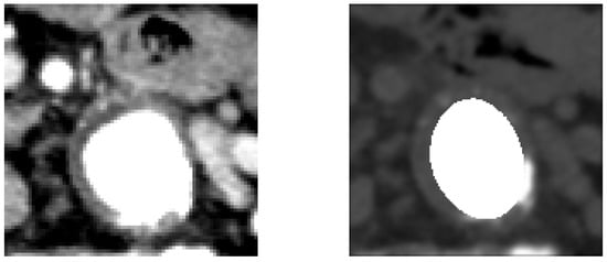 In order to solve the problem, we have applied a series of algorithms to the basal images for the automatic segmentation of the lumen of the vessels, thus avoiding the injection of the contrast medium, which is required by the gold standard diagnostic procedure for detecting the aneurysms of the aorta artery. This procedure has been applied on images of size , with slice thickness equal to 1 mm. The parameters of the windowing of the basal sequence ( and ) have been chosen in such a way that the structure of the aorta was identified. On the other hand, those of the windowing of the contrast medium sequence ( and ) have been chosen in such a way that the contrast agent appeared at full scale with respect to the rest of the image (i.e., completely white).