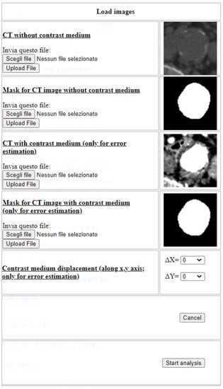 The procedure previously described, together with the error indices, has been automatized and implemented in the PHP language within a web portal, namely ImageLab, which requires as input the basal ROI and the one with constrast medium, together with their respective masks, as it is shown in Figure 6.