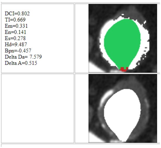 As an example, in Figure 14, there are the results of the processing of one of the 15 patients. On the left there is the basal image after the cropping process; only the aortic vessel needed to be highlighted, from which the patent lumen is to be extracted. At the center, instead, we have the reconstruction of the vessel using the SK and subsequent segmentation algorithms. Finally, on the right there are the related images with contrast medium, as reference. As can be seen, visually the algorithm is able to extract the patent area, with a fairly good degree of accuracy compared with the reference image. This is also confirmed by the trend of the error rates. In particular, the Dice Index (DCI), which measures the white pixels correctly classified by the algorithm, is on average greater than 0.82 (rounded), which indicates that the reference image (with the contrast agent) and the image extracted by the algorithm have a match greater than the 82%. A similar positive trend can be found for the Tanimoto Index (TI), which measures the ratio between correctly classified pixels and the total number of white pixels present both in the image extracted by the algorithm and in the reference one. The misclassification error (), which gives us a measure of misclassified pixels (occluded ones classified as pervious and vice versa), despite having been implemented in such a way that it conservatively estimates the lack of similarity between the two images, is on average no higher than 0.3 (rounded) and represents the complementary of TI. Finally, the bias index () mainly settles on negative values (average lower than −0.04), indicating that the algorithm tends to slightly underestimate the patency area, a characteristic that turns out to be positive from a clinical point of view, as it offers a more pessimistic assessment of the aneurysmal area.